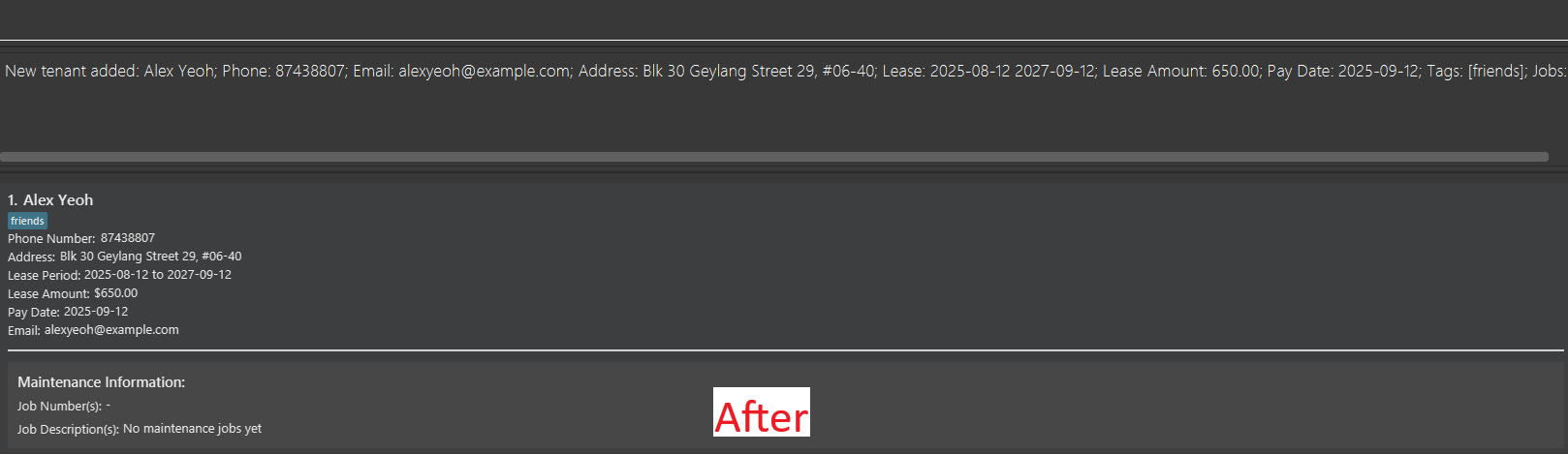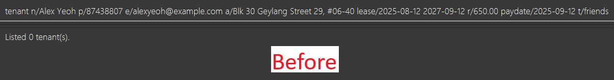 | Add Tenant | tenant n/NAME p/PHONE e/EMAIL a/ADDRESS lease/START END r/AMOUNT paydate/PAYDATE | tenant n/John Tan p/91234567 e/jtan@example.com a/Blk 123 #12-34, Bedok lease/2025-01-01 2026-12-31 r/2800.00 paydate/2025-01-01 |