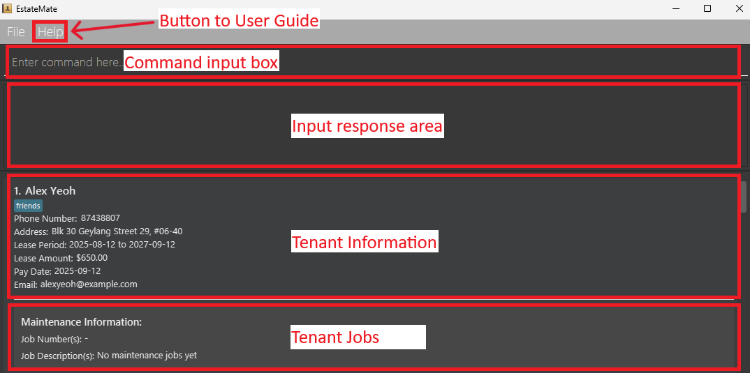 | Edit Tenant | edit TENANT_NUMBER [n/NAME] [p/PHONE] [e/EMAIL] [a/ADDRESS] [lease/LEASE] [r/AMOUNT] [paydate/PAYDATE] [t/TAG]…​ | edit 2 n/James Lee p/23847674 e/jameslee@example.com a/Kent Ridge, Blk #520 lease/2025-01-01 2026-12-31 r/1234.56 paydate/2025-02-01 t/friend |