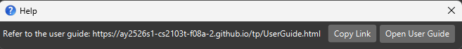 helpOpens the help window which provides a link for accessing the user guide to get assistance with commands. This command is useful if you need a quick reminder on how to use the available commands.