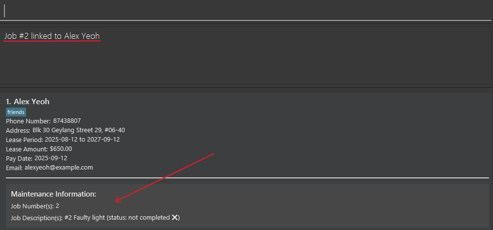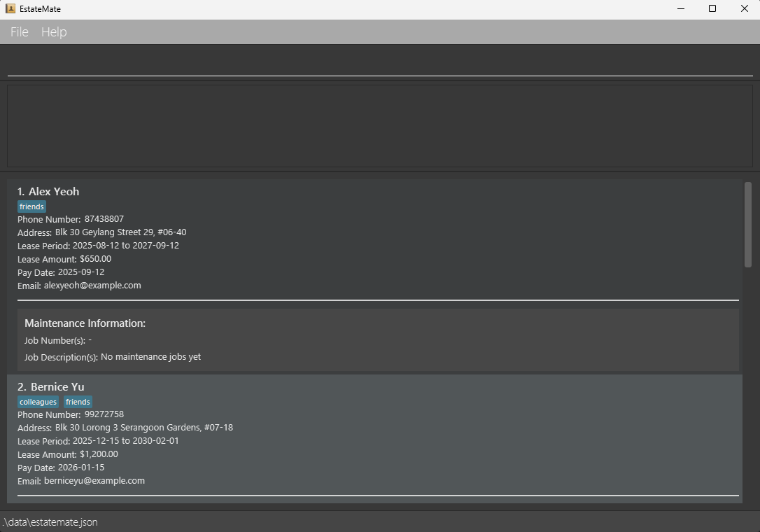 tenant n/John Tan p/91234567 e/jtan@example.com a/Blk 123 #12-34, Bedok lease/2025-01-01 2026-12-31 r/2800.00 paydate/2025-01-01tenant n/Sarah Kim p/12398653 e/sarahk@example.com a/Blk 234 #56-78, Clementi lease/2025-02-02 2027-02-02 r/4000.00 paydate/2025-02-02âť— Warning: