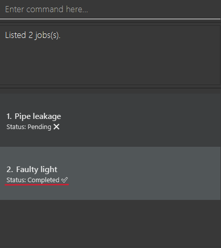 ljob command will be ignored.ljob command without any jobs stored in the application will show you an empty list, hence you are recommended to add some maintenance jobs before using this command.markUpdates the status of a maintenance job to Completed so that you can track completed maintenance jobs easily.