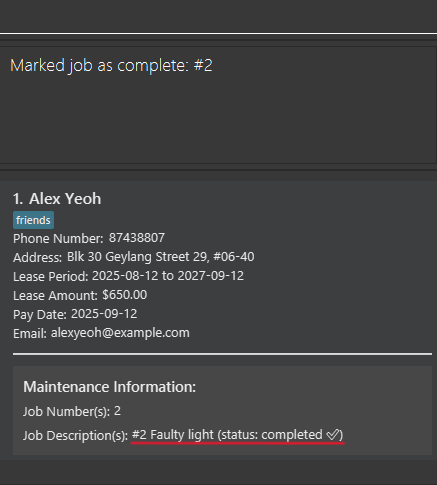 ljob to double-check the job list before using unmark to ensure you’re updating the correct job.mark to revert mistakes if you accidentally unmark a job.clearRemoves ALL tenants and maintenance jobs from the application.